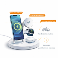 La station aligne iPhone, Apple Watch et AirPods au bon endroit pour une recharge simple, rapide et sans effort. Tout est prêt quand vous en avez besoin.